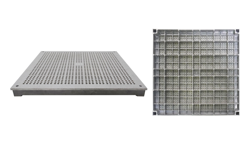 INOSFLOR aluminum perforated panels are made of high strength pure aluminum, with 2000 ton die cast machine, the grating floor is used with aluminum solid floor system where need ventilation. Normally for clean room or semi-conductor production workshop, stable temperature and humidity is strictly required,the air conditional system under raised floor can fully meet such requirement, and that is the import point to use the grating floor for air ventilation.